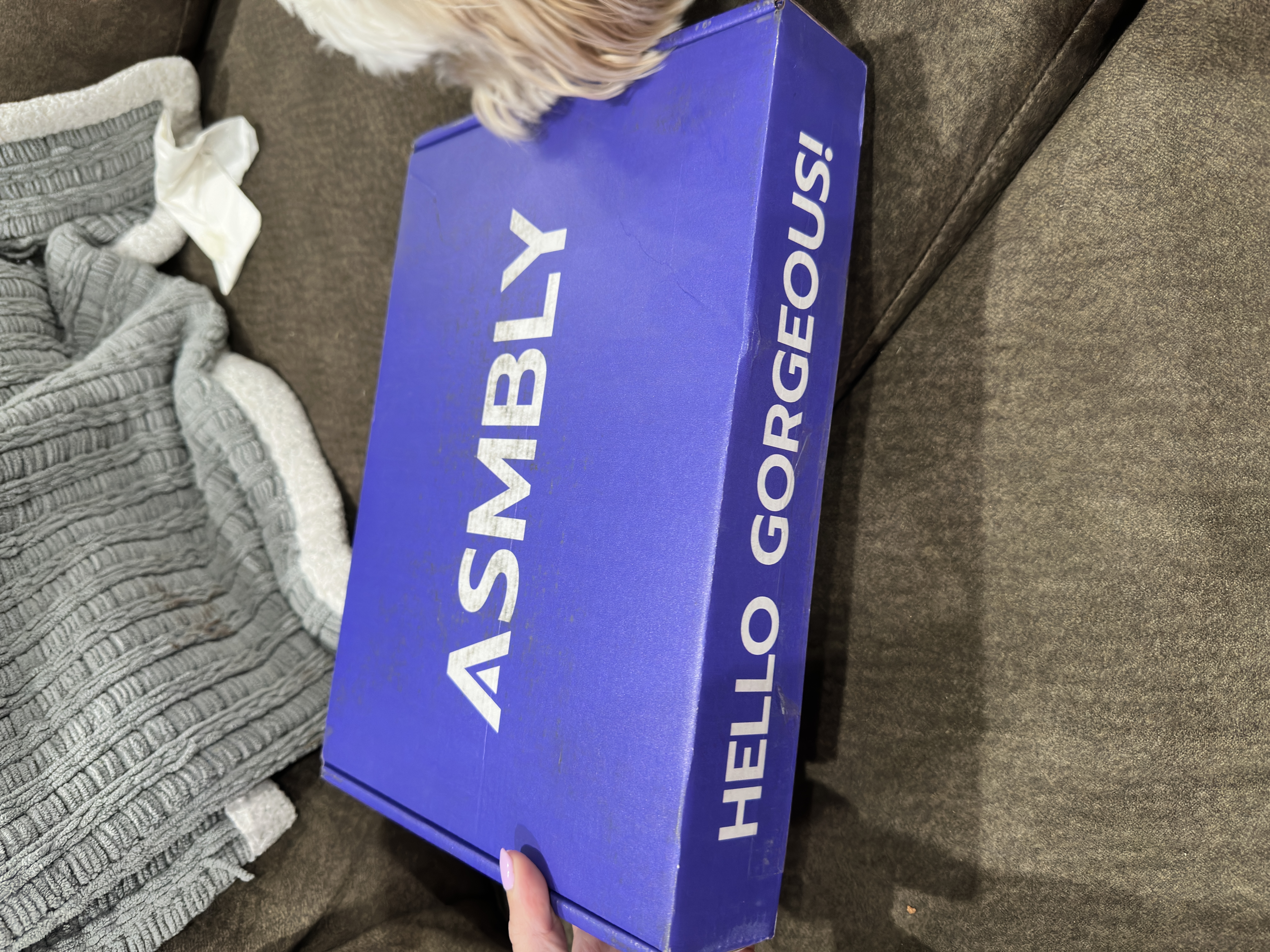 My first three items of ASMBLY’s line arrived and I got the excitement with the order confirmation that I couldn’t even stand the wait. When my order finally arrived, I was blown away by the cute box sitting on my door step. This gorgeous purple (I’m sure there is a better and exact name for this color, but it’s my favorite purple with the blue mixed in,) box with the cutest message on the side, “hello gorgeous,” just sat there staring at me. Can you even? Complimenting me already?! I wasted no time opening this box.