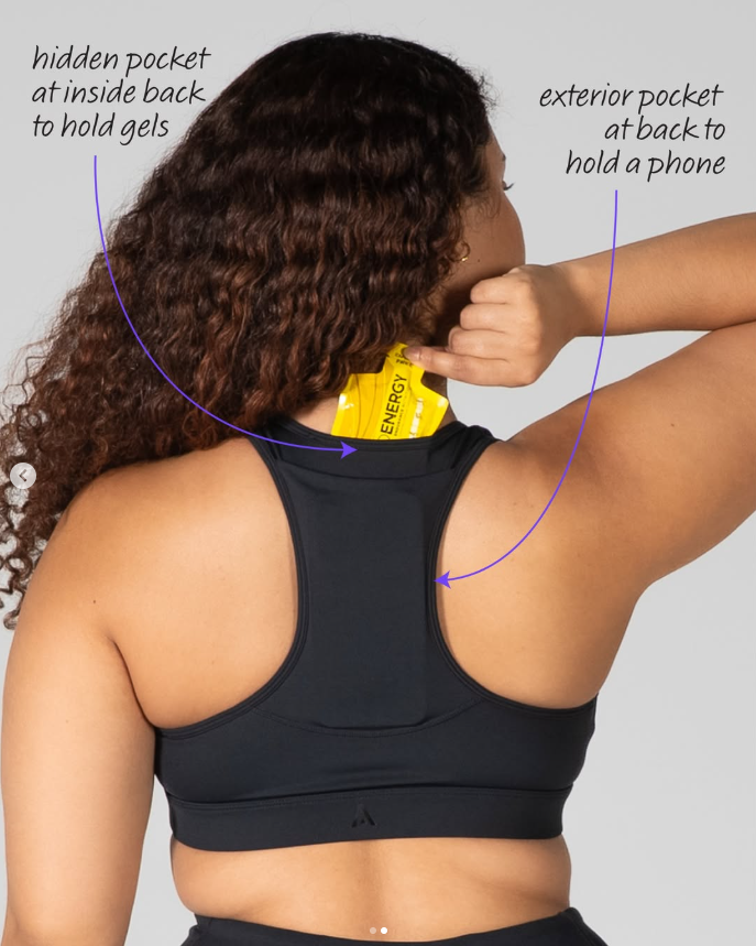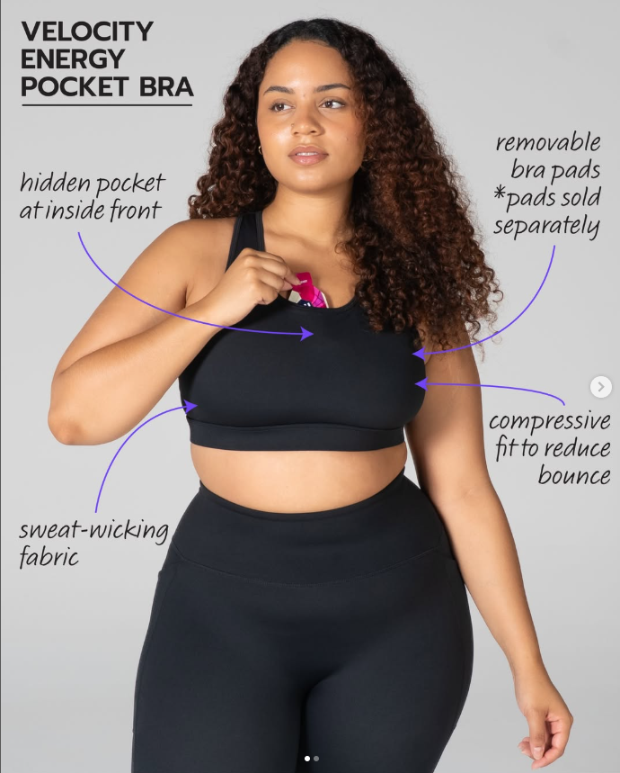 Let’s get to the try on part. This was a surprise to me, because while we got some sneaks, I didn’t know how many pockets were going to be on each piece and I definitely had no clue where they would be. I grabbed the Velocity Energy Pocket Bra and threw it on. First I investigated where the pockets were. Front pocket on the chest, comfortably placed between the prized jewels. Two pockets on the back, one inside the bra and one on the outside of the bra. Mind blown. Fit super comfortable. I did not feel like I was being suffocated, but definitely felt supported. Some great ideas have come from the community on how to use all the pockets. My favorite was using the front pocket for ice. As a runner in the Midwest, this was a great idea. Or also holding ice cold/frozen handhelds. I guess in the winter, you could probably even throw your hot hands handwarmers in there too!